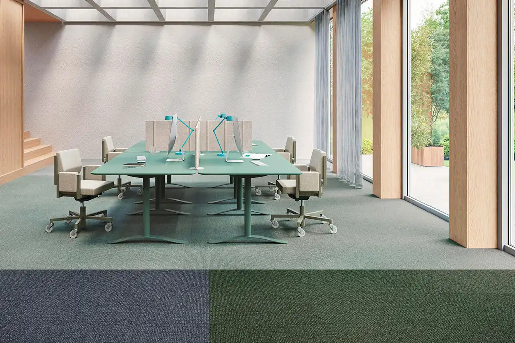 Cambie el ritmo de su espacio. La colección de baldosas de moqueta modular Motion se mueve con fluidez. Los colores fluyen con una textura dinámica y un patrón de desplazamiento. Gracias a sus 12 colores, puedes crear ambientes con coreografía propia que desafían las percepciones y superan las expectativas.